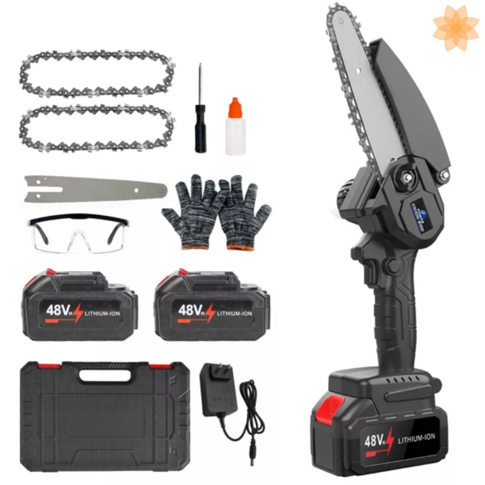 MOTOSIERRA ELECTRICA DOBLE BATERIA Esta sierra eléctrica es muy adecuada para cortar madera, podar ramas de árboles, jardinería.Potente sistema dinámico: la minimotosierra inalámbrica adapta la cadena guía de alta calidad que se ha sometido a un proceso de enfriamiento profundo garantiza un corte suave.La motosierra eléctrica está equipada con un motor de cobre puro para proporcionar una fuerte potencia, el diseño de dientes de madera puede hacer que la sierra de cadena se pegue en las ramas, cortando de manera más eficiente y rápida.Diseño de cuerpo ligero: la mini motosierra tiene un diseño ergonómico y ligero con alto rendimiento, por lo que es una herramienta perfecta para granja, jardín, uso doméstico. Las mujeres también pueden usarlo fácilmente sin sentirse cansadas.Fácil de instalar y operar: simplemente instala en unos pocos pasos. 1. Instala la cadena en la placa guía, luego instálala en el cuerpo de la motosierra. 2. Instala la cubierta lateral y aprieta la tuerca. 3. Utiliza el destornillador en el paquete para girar el tornillo y ajustar la tensión. Solo necesitas 1 minuto para toda la instalación. Incluye:1 * Mini motosierra2 * batería de litio 48V2* cadena de corte1 * maletín1 * par de guantes1 * gafas de protección1 * adaptador de corriente1 * destornillador1 * guía de usuario.
